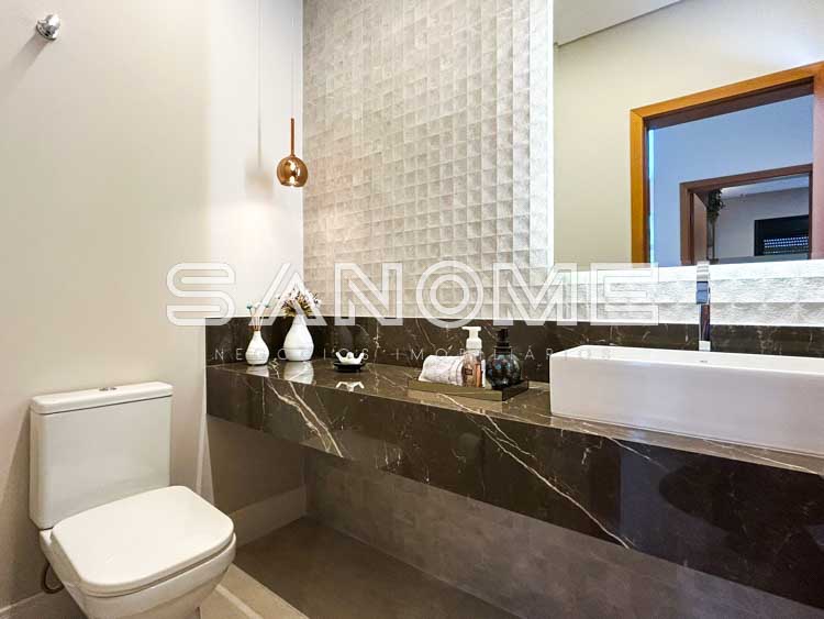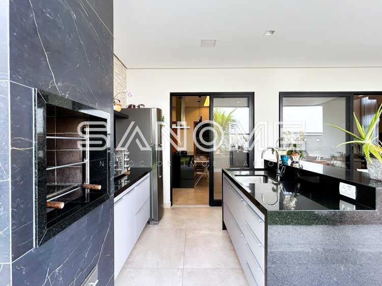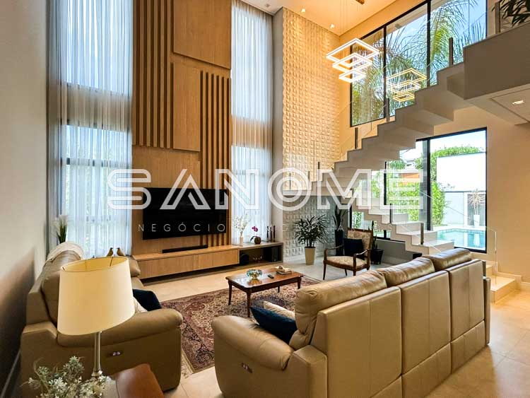 Piso térro: Hall de entrada com lavabo e escritório (reversível +1 suíte), Sala de estar com pé direito duplo, Sala de jantar, Cozinha integrada completa (com torre, forno elétrico. 2 geladeiras em aço escovado e micro-ondas), Área de serviço com hobby box, Área gourmet, Banheiro de lazer externo, Quintal gramado e Piscina aquecida (iluminação LED).
