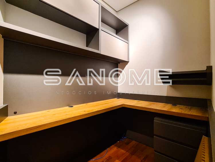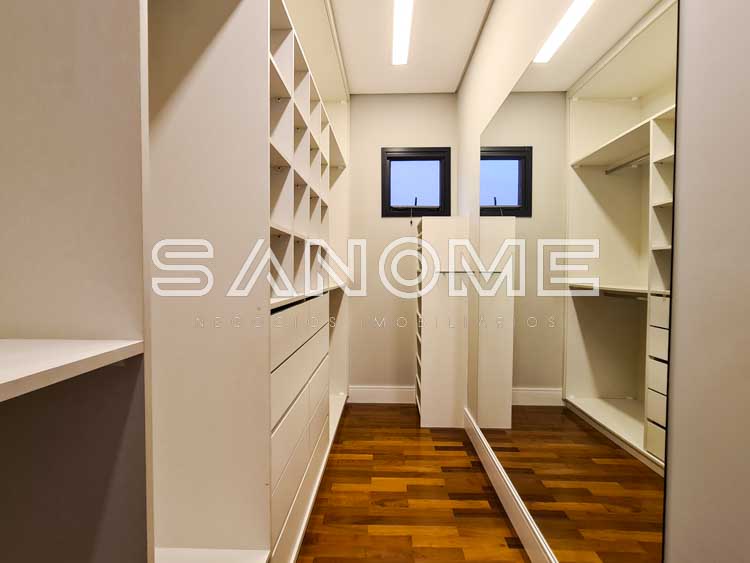 Piso superior: Corredor com armários + 3 suítes (master com closet e escritório privativo).