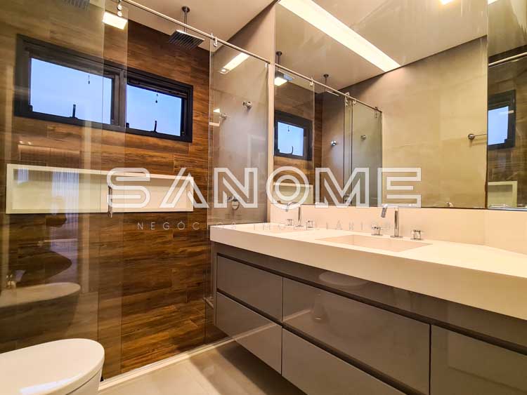 Piso térreo: 1 suíte, Salas integradas com pé direito duplo, Cozinha integrada (com eletrodomésticos), Despensa, Área de serviço, Varanda externa, Área gourmet completa com churrasqueira e forno de pizza, Brinquedoteca, Banheiro de lazer externo e Piscina com spa e prainha.